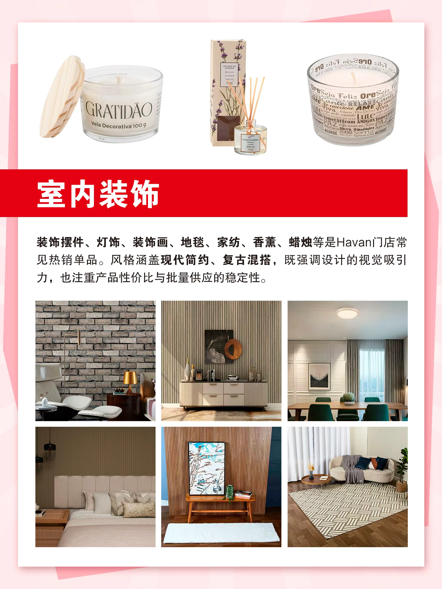 💼长期以来,Havan高度依赖中国供应链采购,从家居用品到节庆礼品,都与中国供应商保持紧密合作关系。其采购需求集中在高设计感、兼具实用与装饰性的产品,尤其关注木、陶瓷、玻璃、纺织等材质的多元化应用。