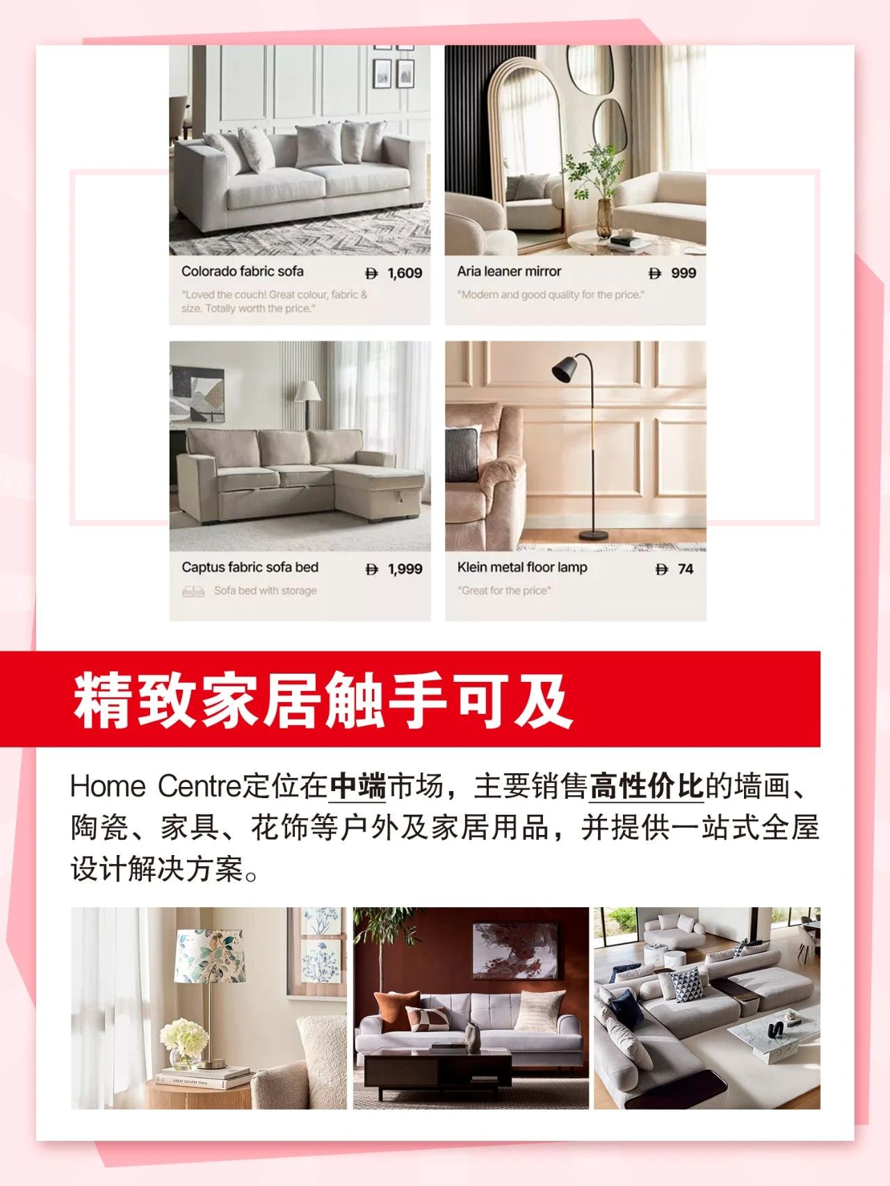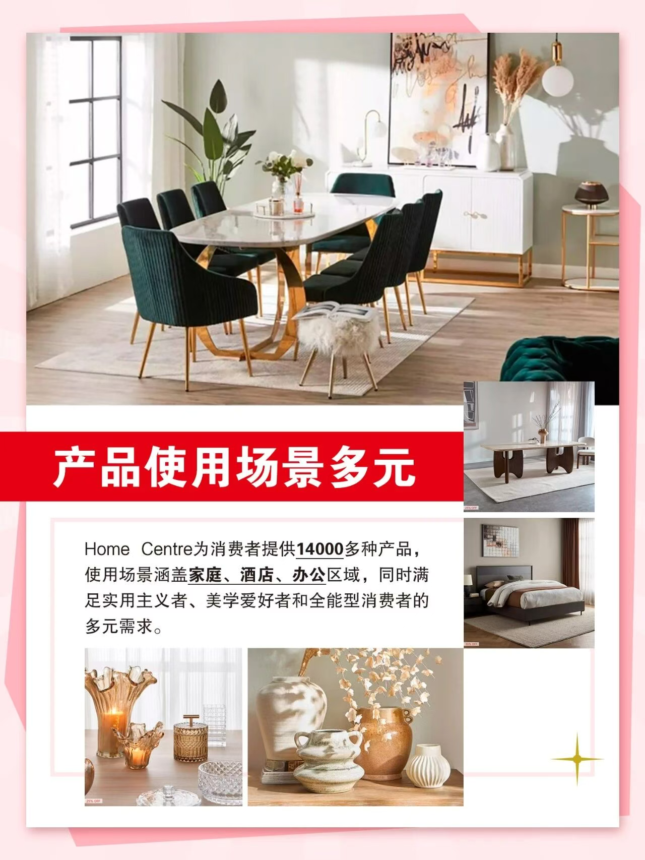 ✨Home Centre定位中端市场,主营家居装饰、户外园艺、家具等14000多种产品,使用场景涵盖家庭、酒店、办公区域。