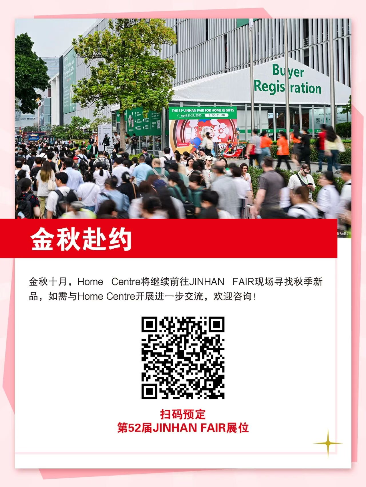 👏金秋十月,Home Centre将到访第52届JINHAN FAIR现场寻找秋季新品,如需与Home Centre开展进一步交流,欢迎咨询!
