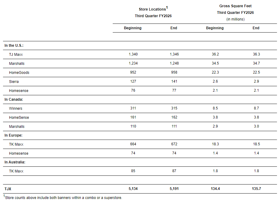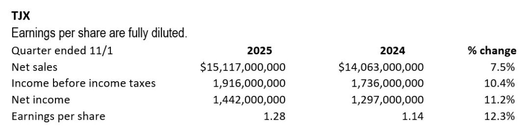 在本财年前九个月,TJX净销售额为426亿美元,同比增长7%。净利润为37亿美元。