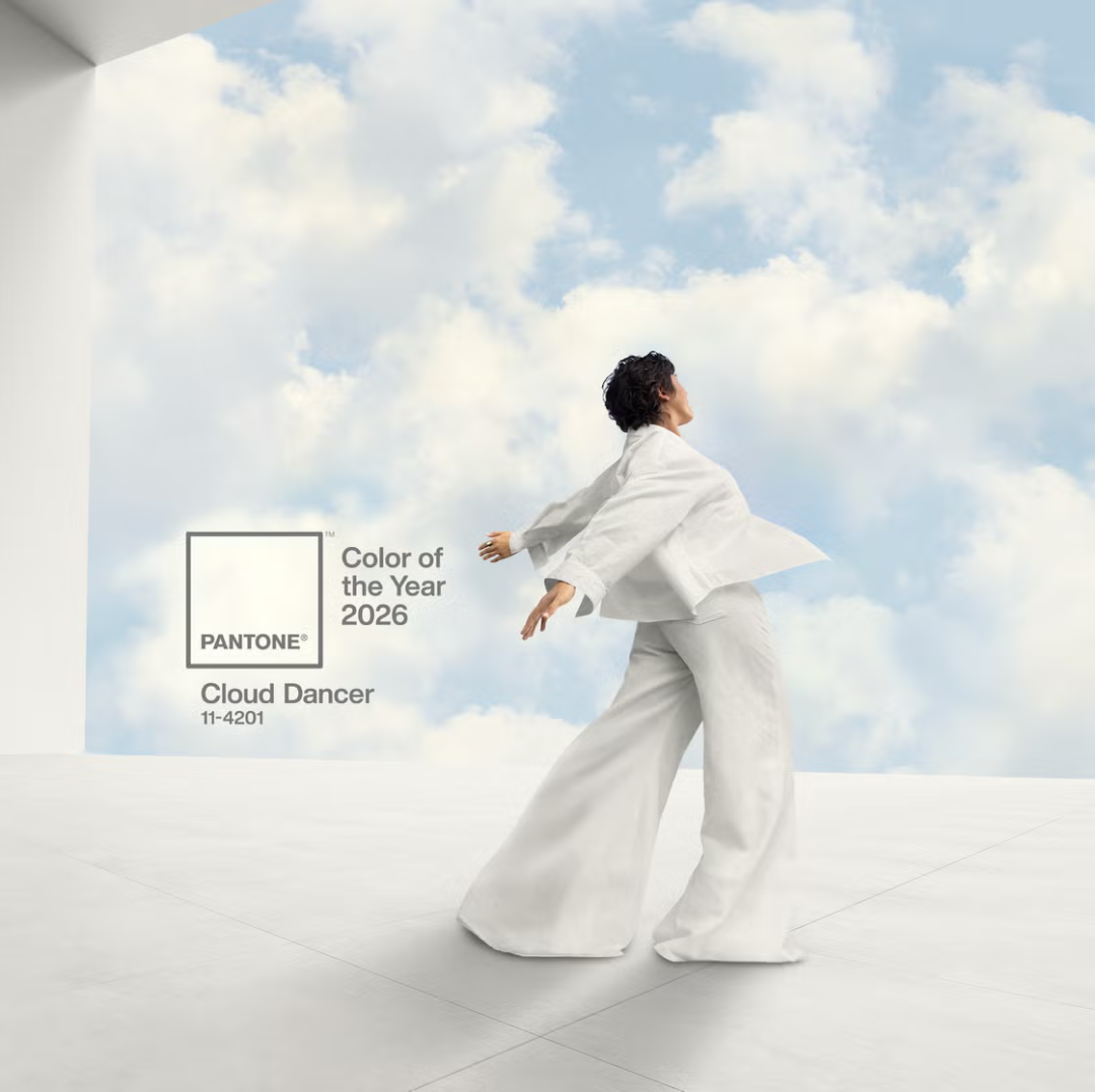 PANTONE宣布2026年度代表流行色为:PANTONE11-4201云上舞白(Cloud Dancer)。这种颜色被描述为一种轻盈、低调的白色,能为忙碌的人们带来宁静、安静心灵的色调。