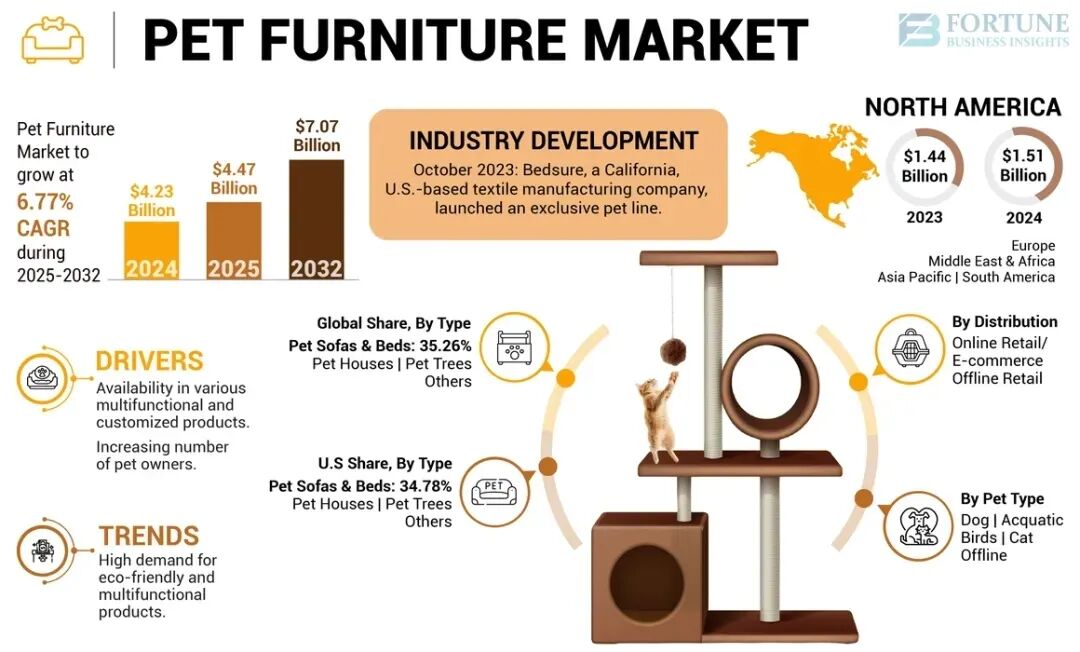数据显示,全球宠物家居市场正步入高速增长通道:市场规模预计将从2024年的42.3亿美元增长至2032年的70.7亿美元,年复合增长率达 6.77%。