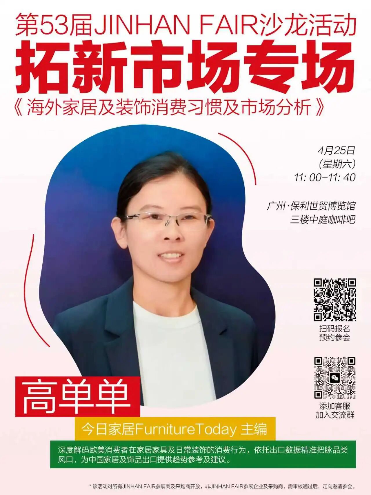 第53届JINHAN FAIR将于2026年4月21-27日在广州保利世贸博览馆举行,本届我们将在三楼中庭咖啡吧打造宠物家居用品潮流陈列区,并特设主题沙龙,邀请业内权威机构/海外买家进行主题分享,每场都干货满满!
