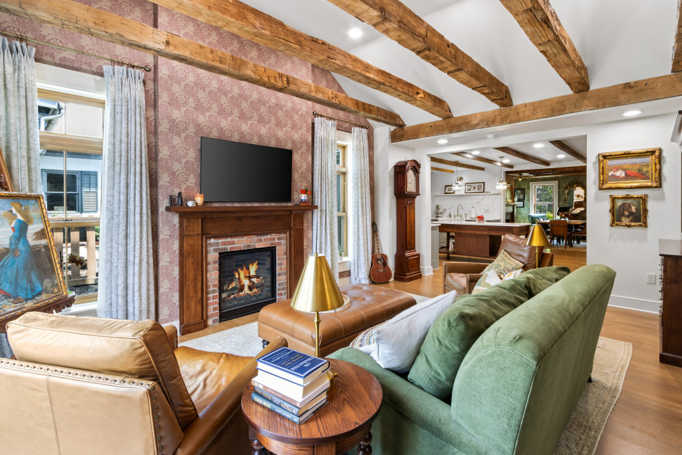 In this historic Columbus, Ohio, home updated by Richard Taylor Architects, the living room features a warm palette of rich woods and browns, a soft green sofa, light burgundy wallpaper and accents of dusty blue.