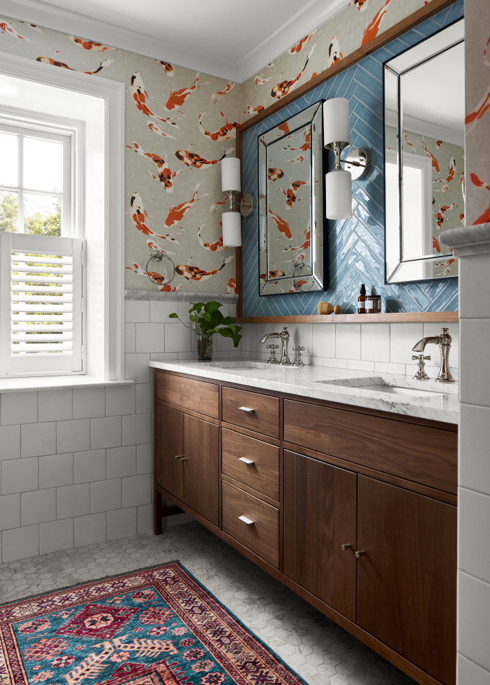Inspired by their former home in Hong Kong, this Philadelphia couple’s bathroom by Airy Kitchens features blue herringbone tile to evoke water and koi fish wallpaper for a playful touch.