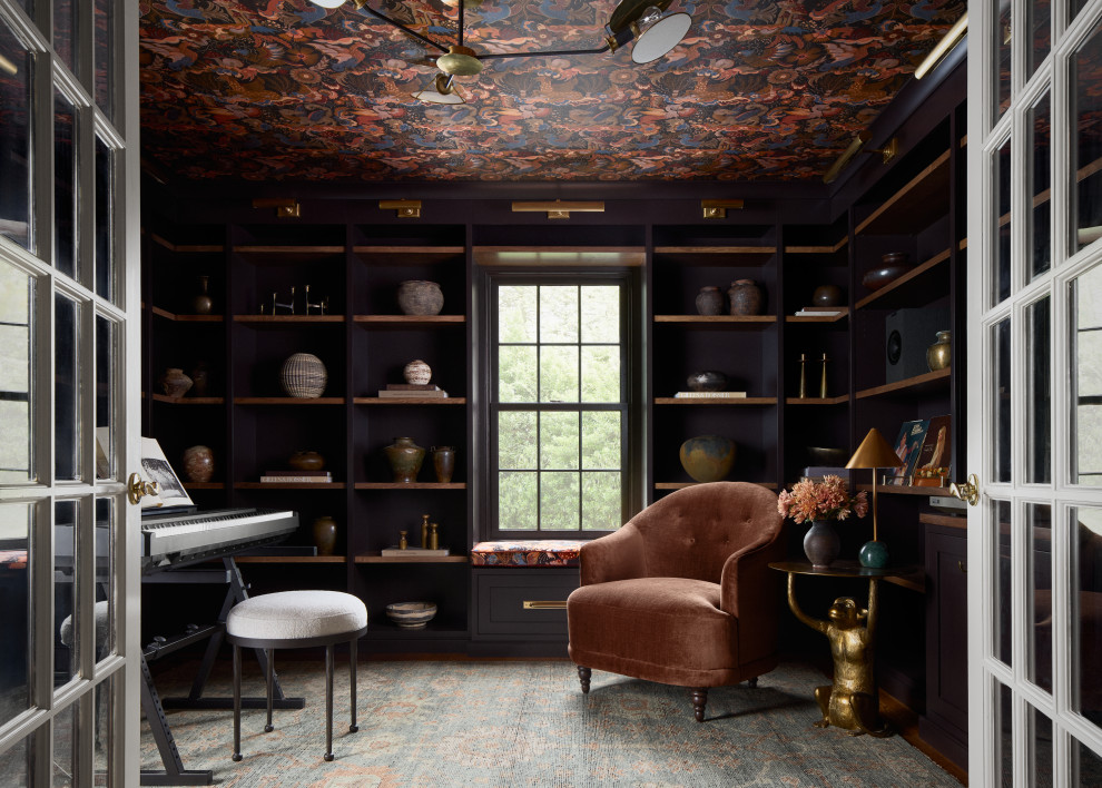 In this Philadelphia family room, Old Soul Interior Design & Renovation Studio applied whimsical wallpaper to the ceiling, pairing it with moody walls and furnishings for a sophisticated Alice in Wonderland effect.