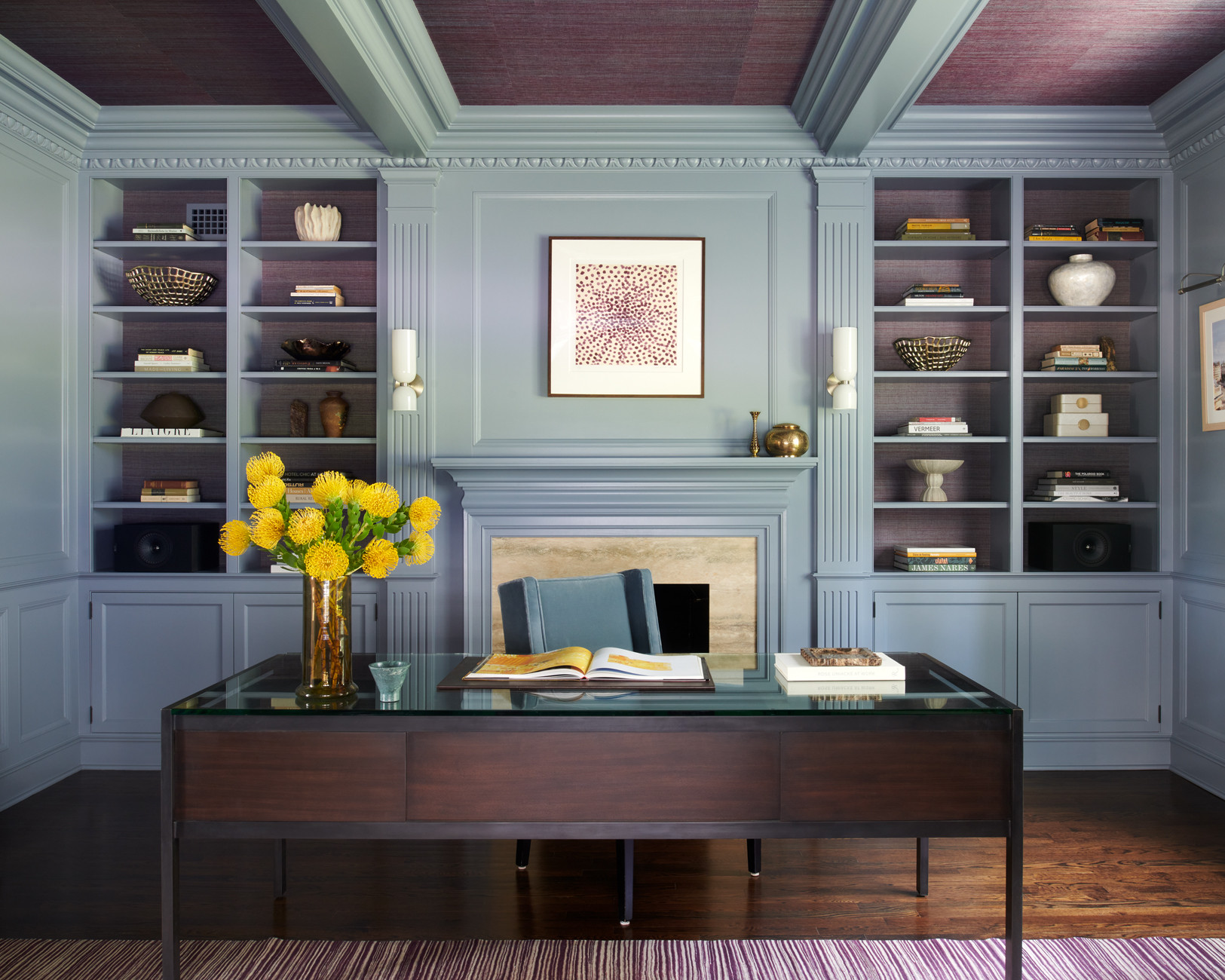 In this Haverford, Pennsylvania, home office by Ernst Brothers, textured wallpaper on the ceiling echoes the wallpaper on the back wall of the open shelves, allowing the powder blue architectural details to stand out.
