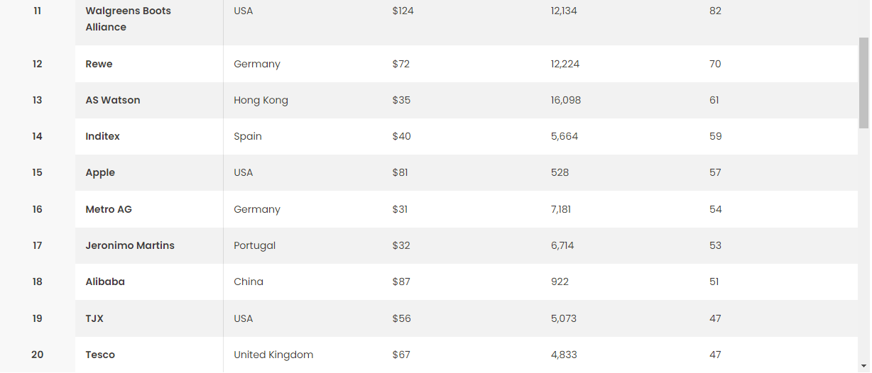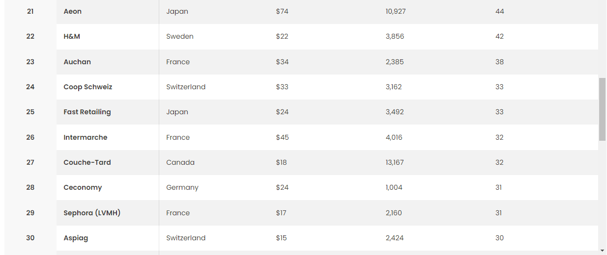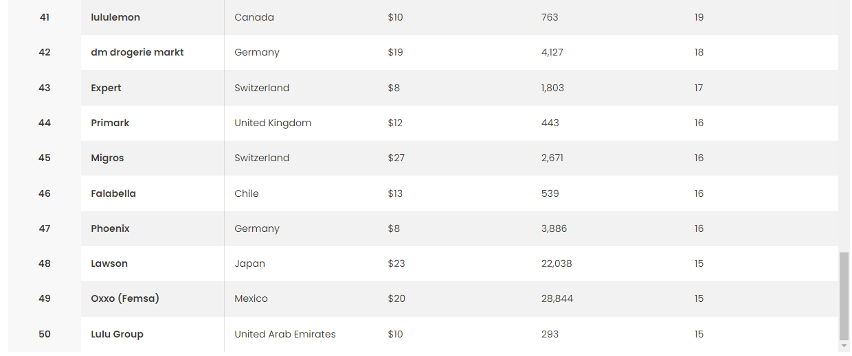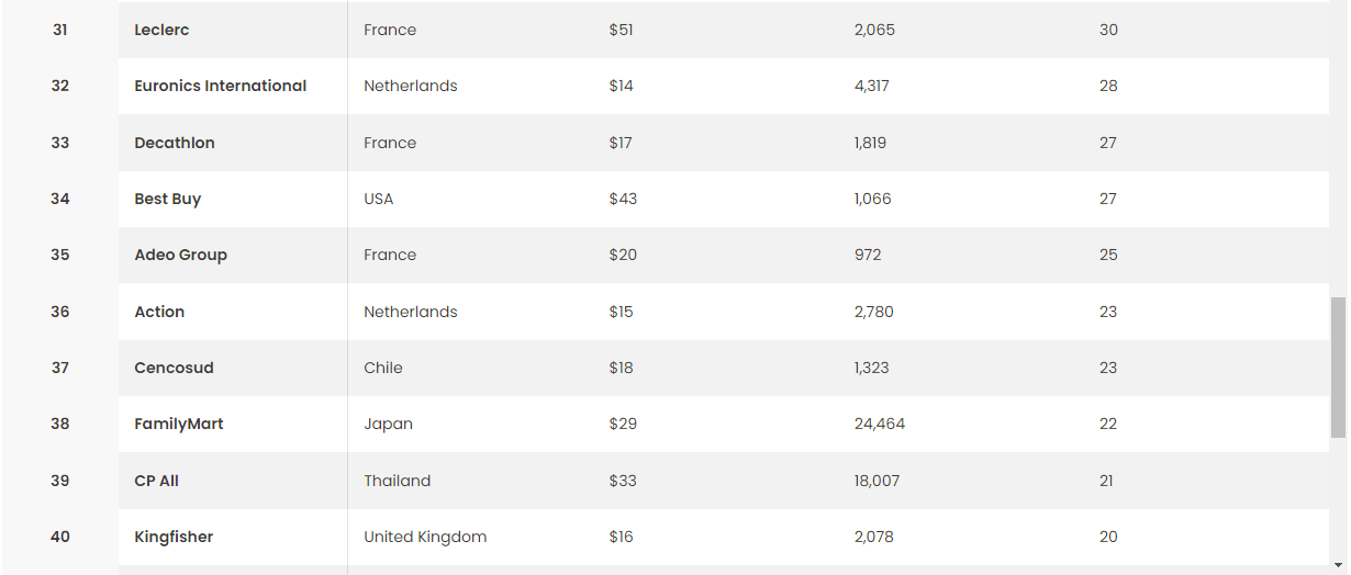 In alignment with Kantar’s Retail IQ methodology, only retail revenues determined rank points. As the largest global retailers continue to expand outside of retail revenues, this list now focuses only on retail-specific revenues.
