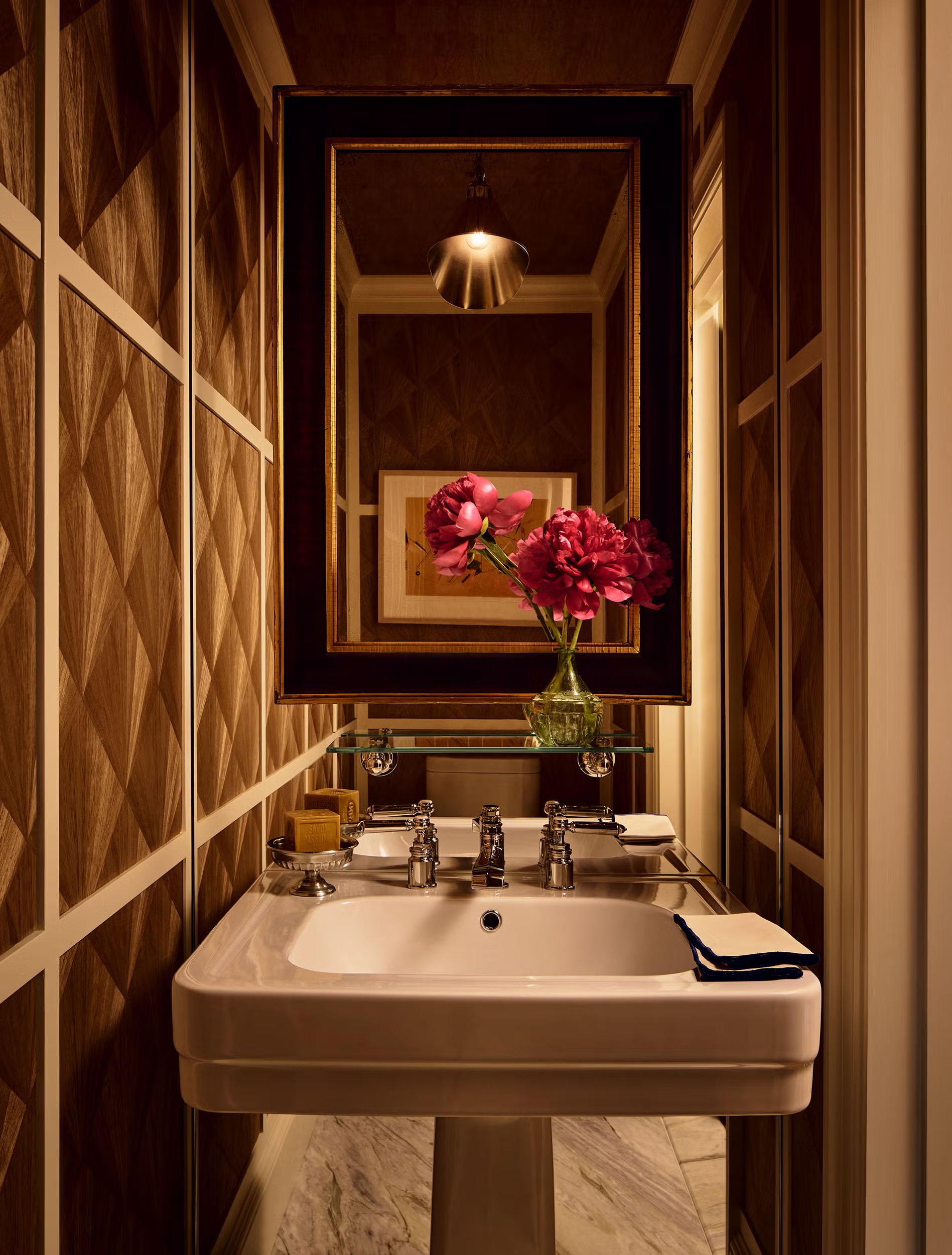 “We wanted this jewel box of a space to feel dark and moody,” says designer Lucy Doswell of this patterned half bath in an Upper East Side apartment. A graphic honeycomb patterned wallpaper from Robert Kime gives the small space plenty of charm.
