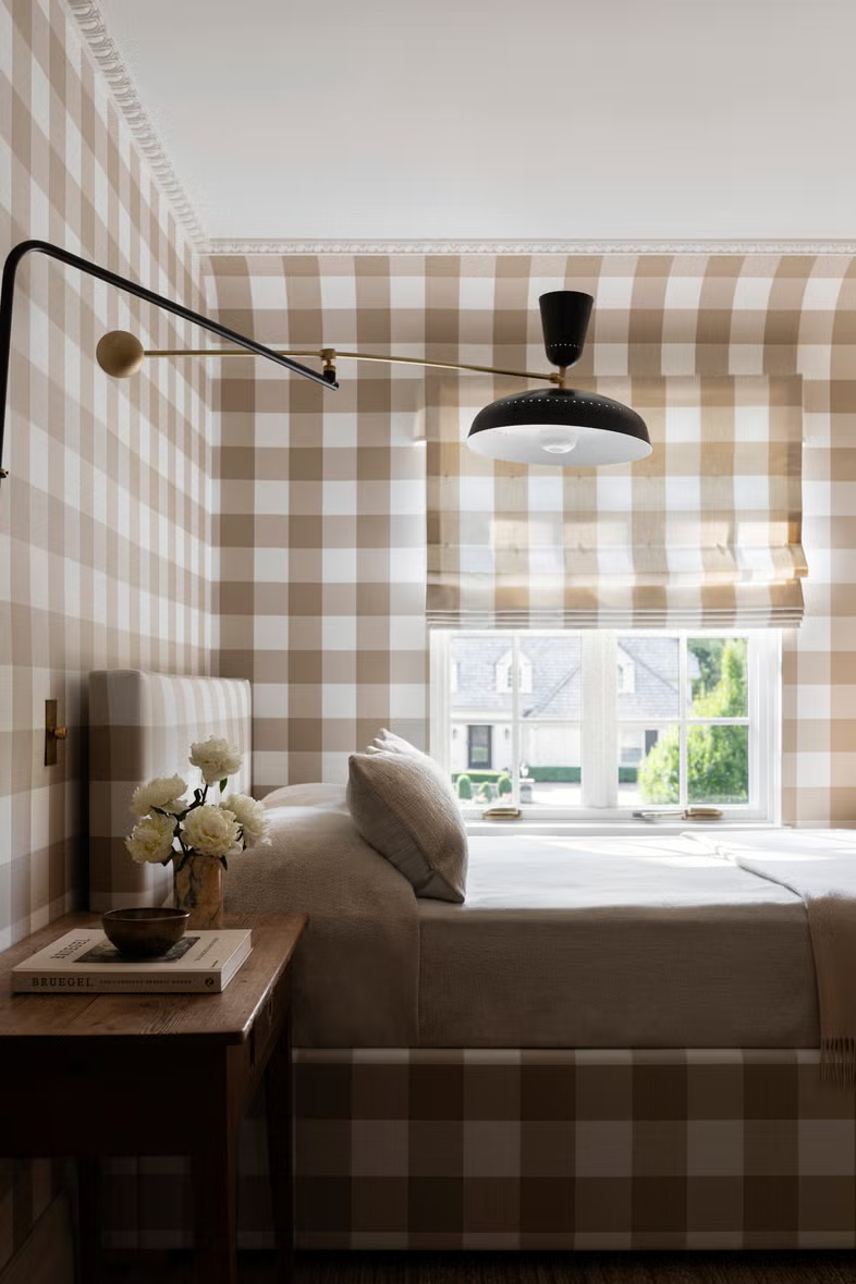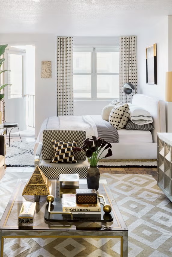 The quickest way to get a cohesive look in such a small room is to choose one pattern/color/print and use it on everything. And we really do mean everything. This studio apartment idea comes from this bedroom by designer Wendy Labrum where large-scale checks are used on all the walls, upholstery, and even window treatments.