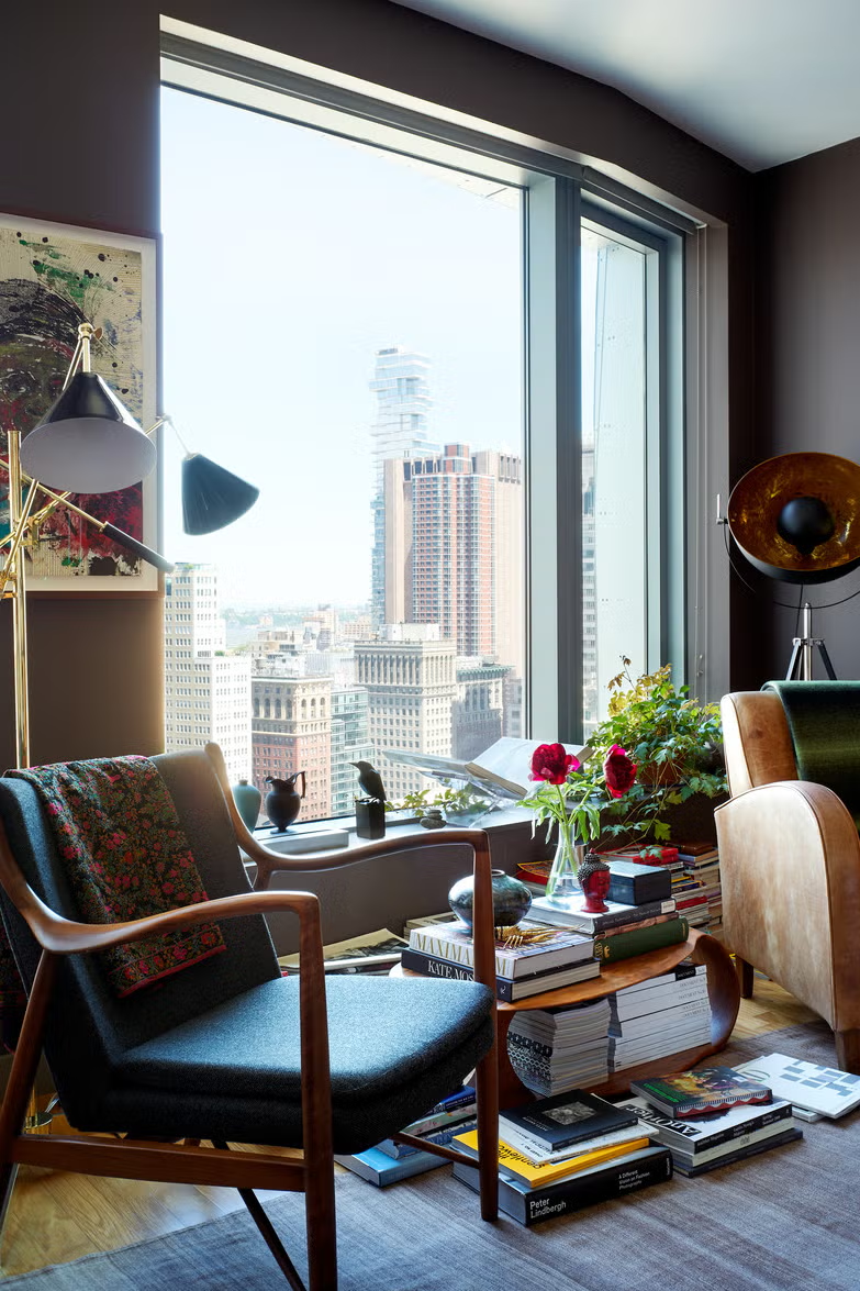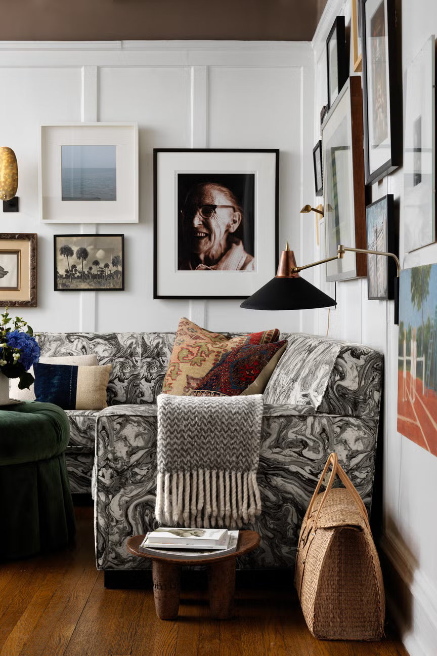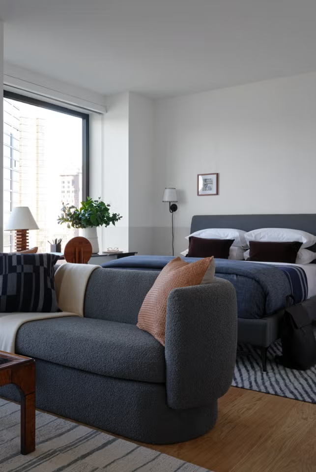 We know, we know—maximalist style in a studio apartment idea can so easily become cluttered and overwhelming. However, designer and 2021 Next Waver Nicholas Obeid explains, “In a small space, too little can be as dangerous as too much.” He says to combat the cramped feeling, he had to pay attention to the scale of the furniture he put in his Chelsea studio. This variation makes the whole apartment feel more dynamic.