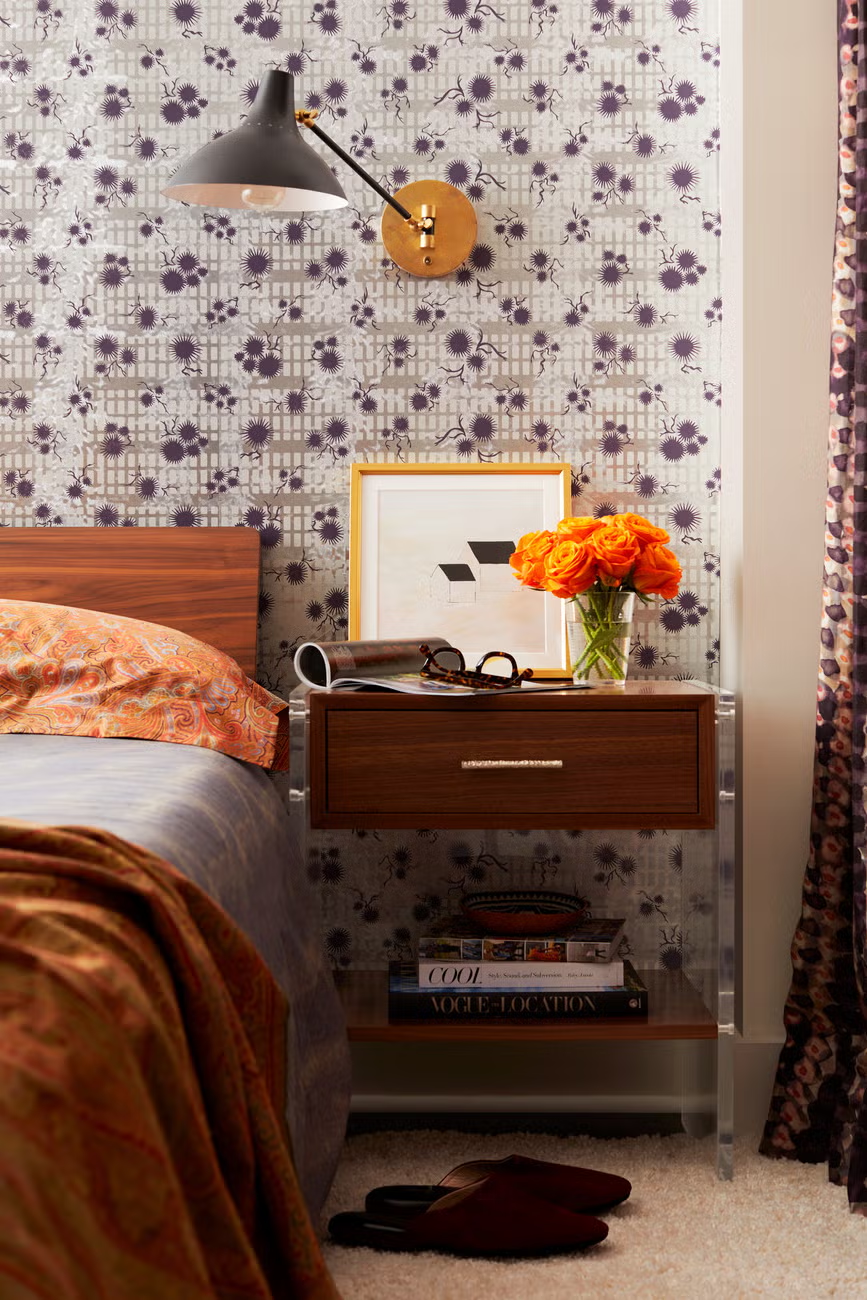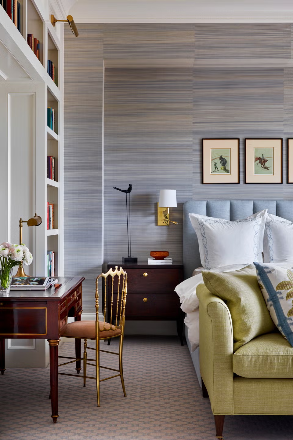 Establish a nook inside the front door as its own entryway with a sitting area. Then shove your bed as far away from the door as possible, like in this Amber Interiors home. Pro tip: Mounting sconces on the wall next to the bed frees up space on the bedside tables.
