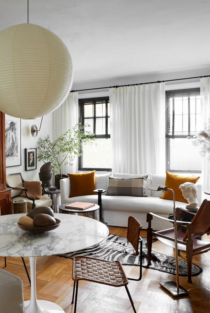 To give an airy and light appearance in this small city apartment, David Frazier opted for many different styles of seating with plenty of negative space. This allows for a less full appearance; a club chair or armchair would've looked too heavy for the small space.