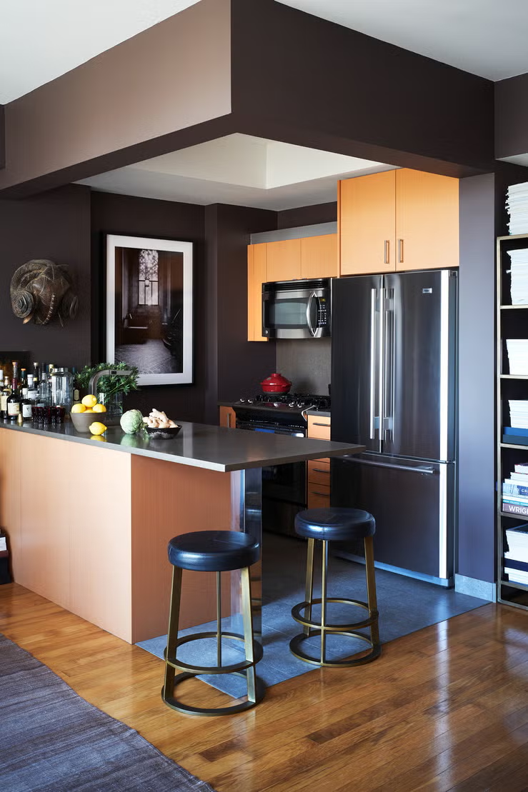 Though light walls tend to be the go-to for opening and brightening up smaller living quarters, a dark paint job can actually do wonders. In this studio apartment idea, photographer Bjorn Wallander used a deep chocolate brown hue to make the studio feel cozy, intimate, and warm.