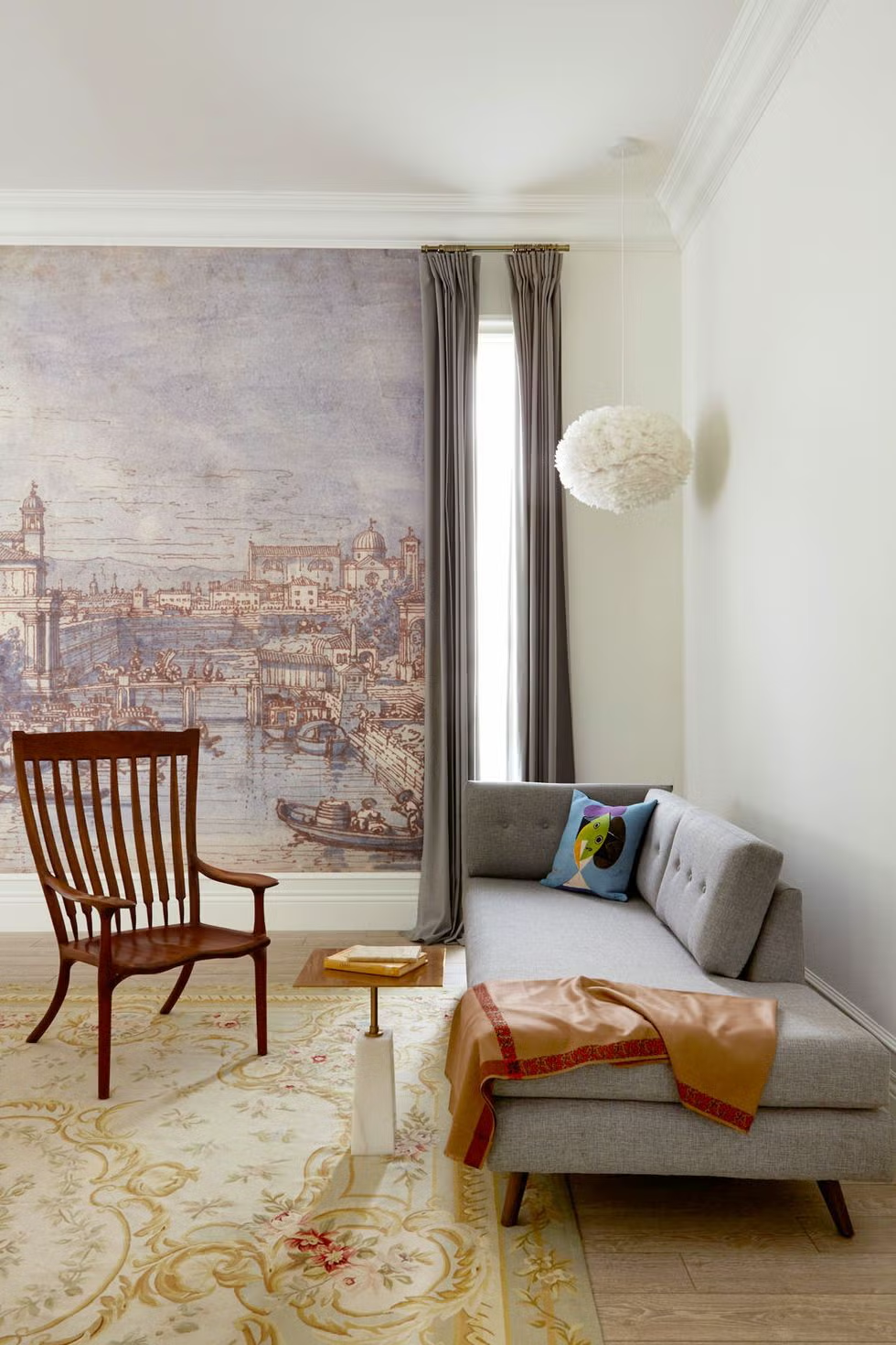 Give your studio a grand feel with high-impact textiles on the wall and floor. This mural creates a sense of expansiveness. Pared down furnishings, like the chaise and simple side table in this space designed by Raji RM, keep the focus where it belongs.