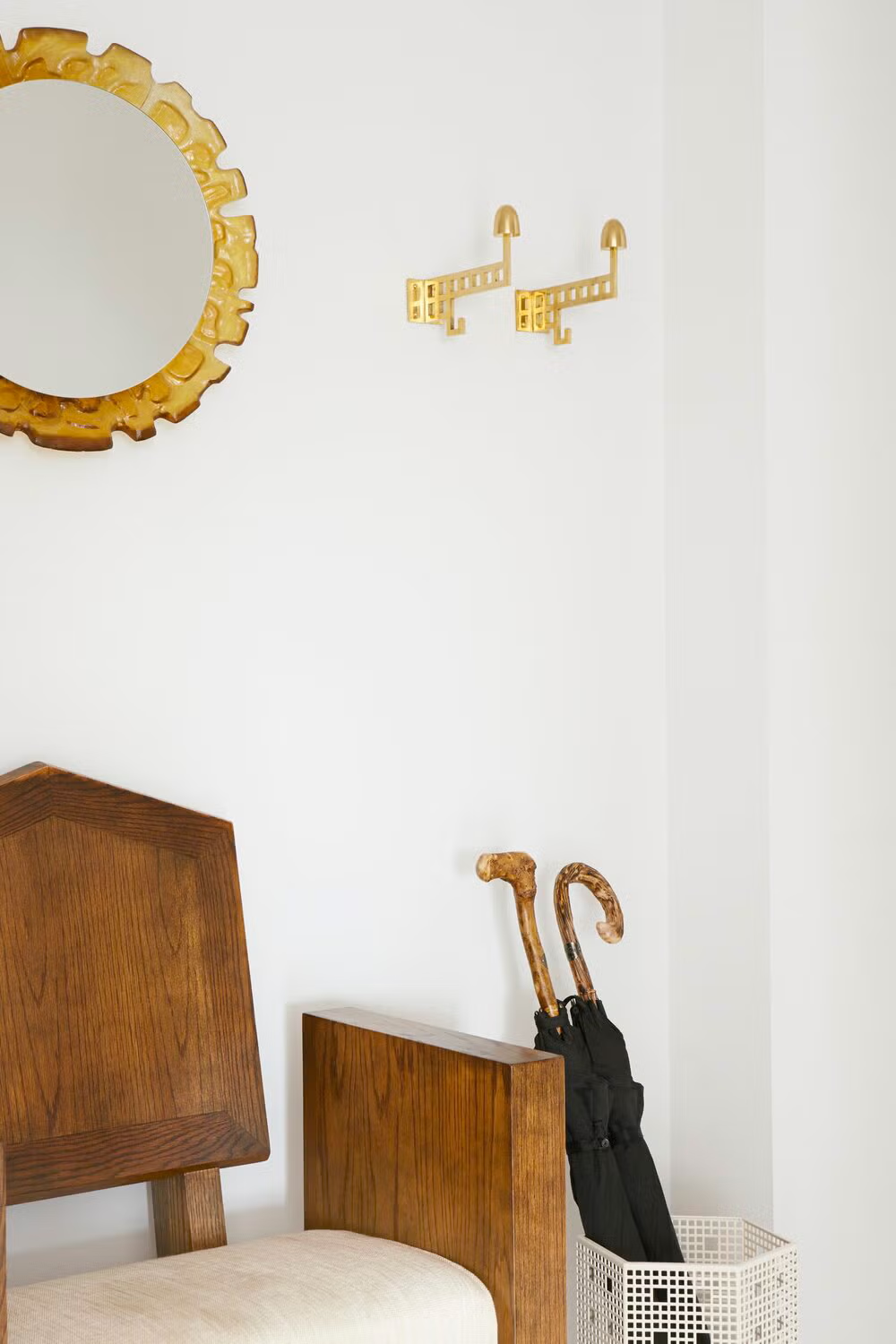 Even in a studio, there should be a section carved out for your grand entrance. This foyer designed Tamsin Johnson proves that you just need a corner, not a designated foyer. All it takes is a chic mirror, accent chair, umbrella holder, and a couple of hooks. If you don't have room for any of that, a mirror and a pedestal with a small catch-all for keys and mail will do.