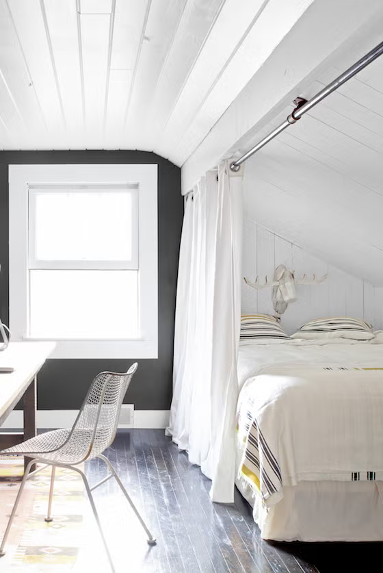 Installing a sliding door would take up precious space in a studio apartment idea, so in its place, hang a curtain to create privacy around the bed. A more diaphanous fabric means light can still stream through and doesn't weigh down the room, like in this attic by Leanne Ford.