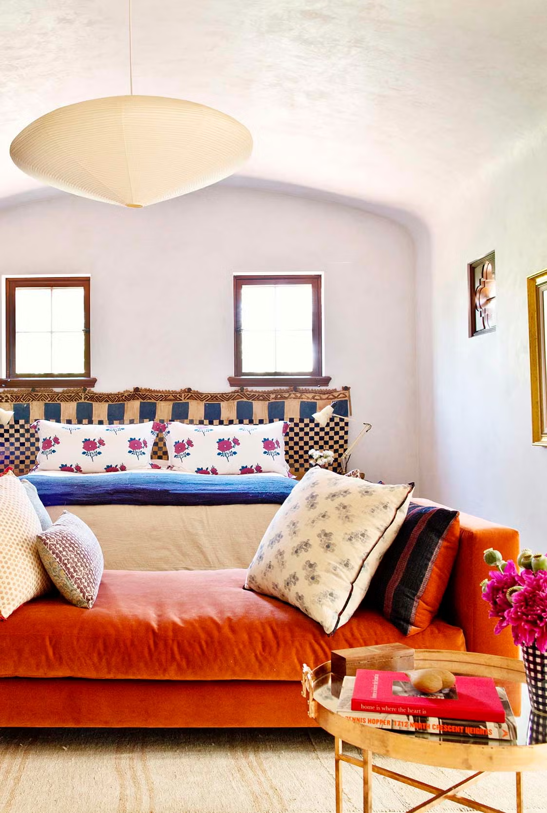 Think of fun ways to bring in additional seating to your studio apartment idea that doesn't take up square footage. This eclectic and organic space designed by Leanne Ford Interiors is a lifesaver for anyone who loves to host guests but doesn't know where to put them. Two small stools work as coffee tables, cushions piled on top of a ledge serve as a makeshift sofa, and a swing hangs from the low ceiling.