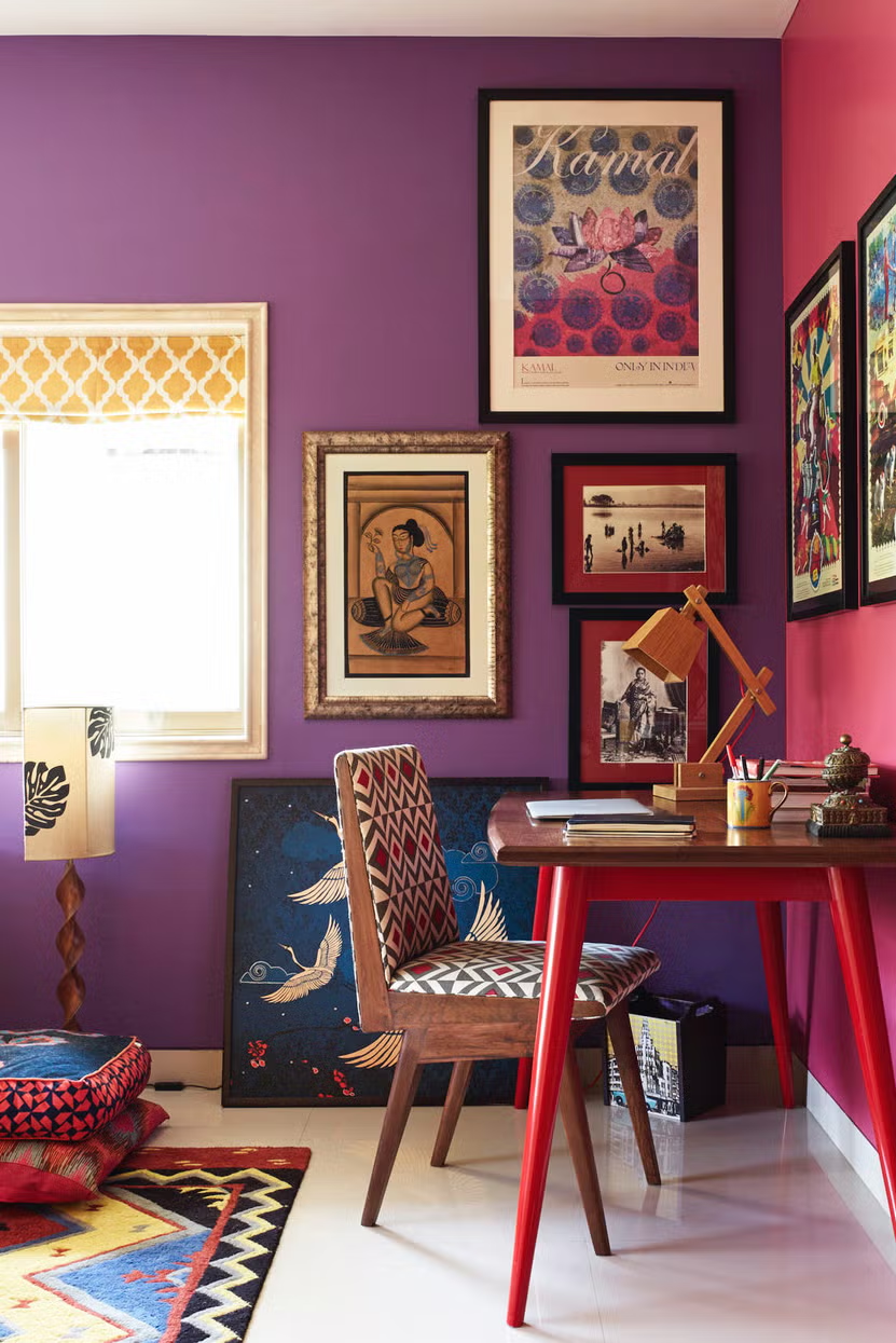 Designer Krsnaa Mehta painted each wall in his apartment a bold jewel tone, hung meaningful artwork, and blended tons of fun prints. The actual furniture pieces, though bold in design, feature sleeker profiles so they don't take up too much physical space.