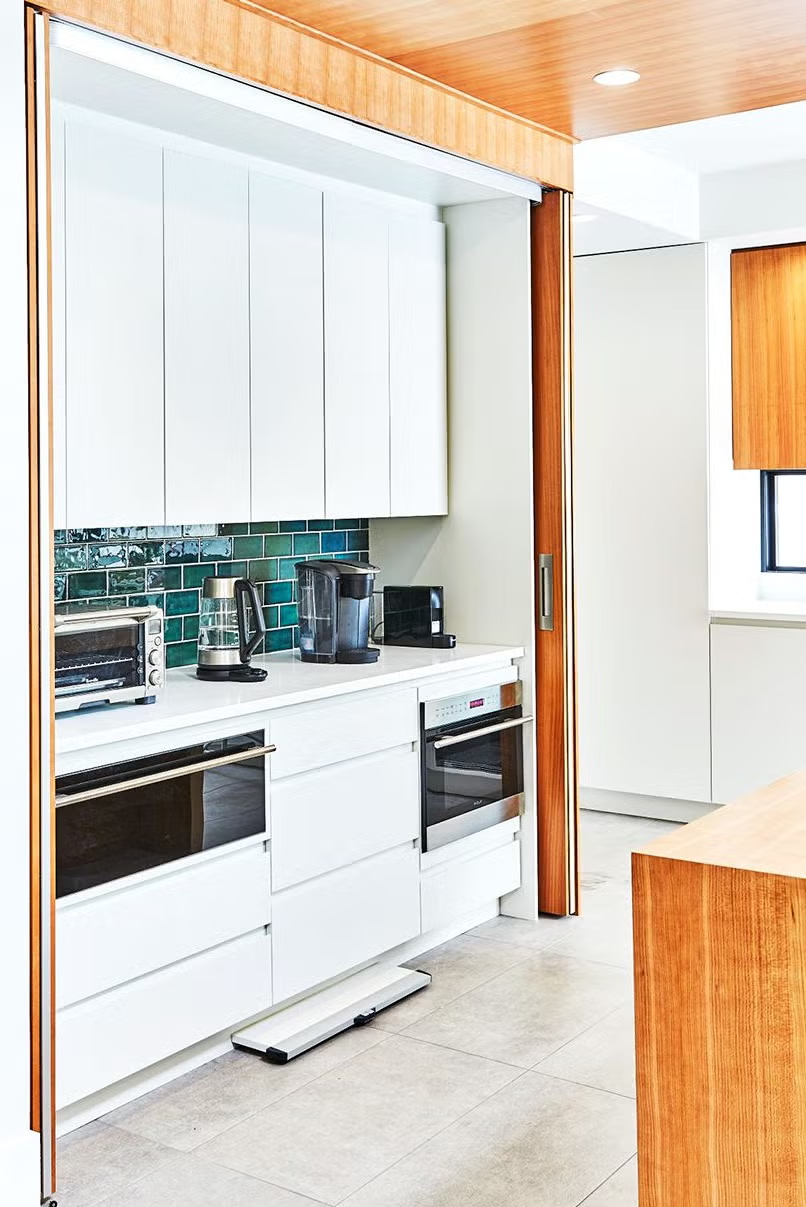 If you can't wrap your head around sleeping in your kitchen, this is the tip you'll want to write down. In this studio apartment idea, Matthew Ferrarini used folding wood pocket doors to conceal an entire wall of cabinets and appliances.
