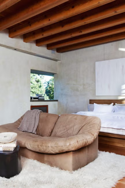 A bench at the end of the bed signals a conversation area, keeping your sleeping area separate from the hangout zone. Reath Design used a small side table in lieu of a coffee table to save space.