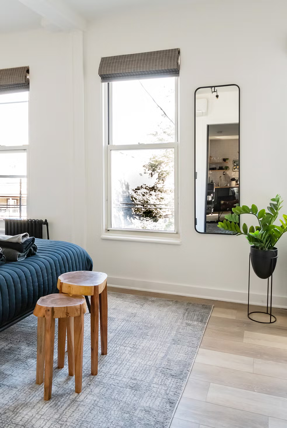 In a studio apartment idea, mirrors are your best friend. They bounce light off the windows, tricking your eye into thinking the space is much brighter and bigger, as exemplified in this apartment designed by Shari Francis.